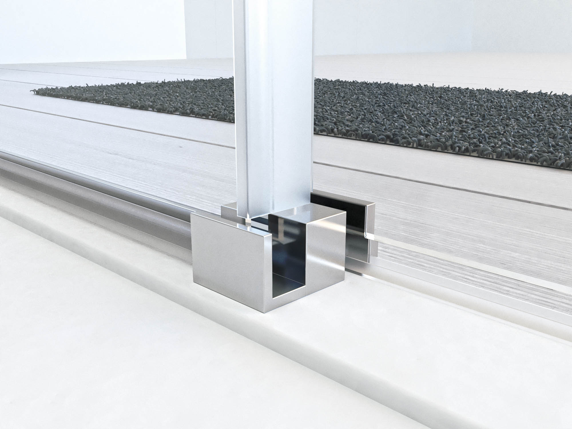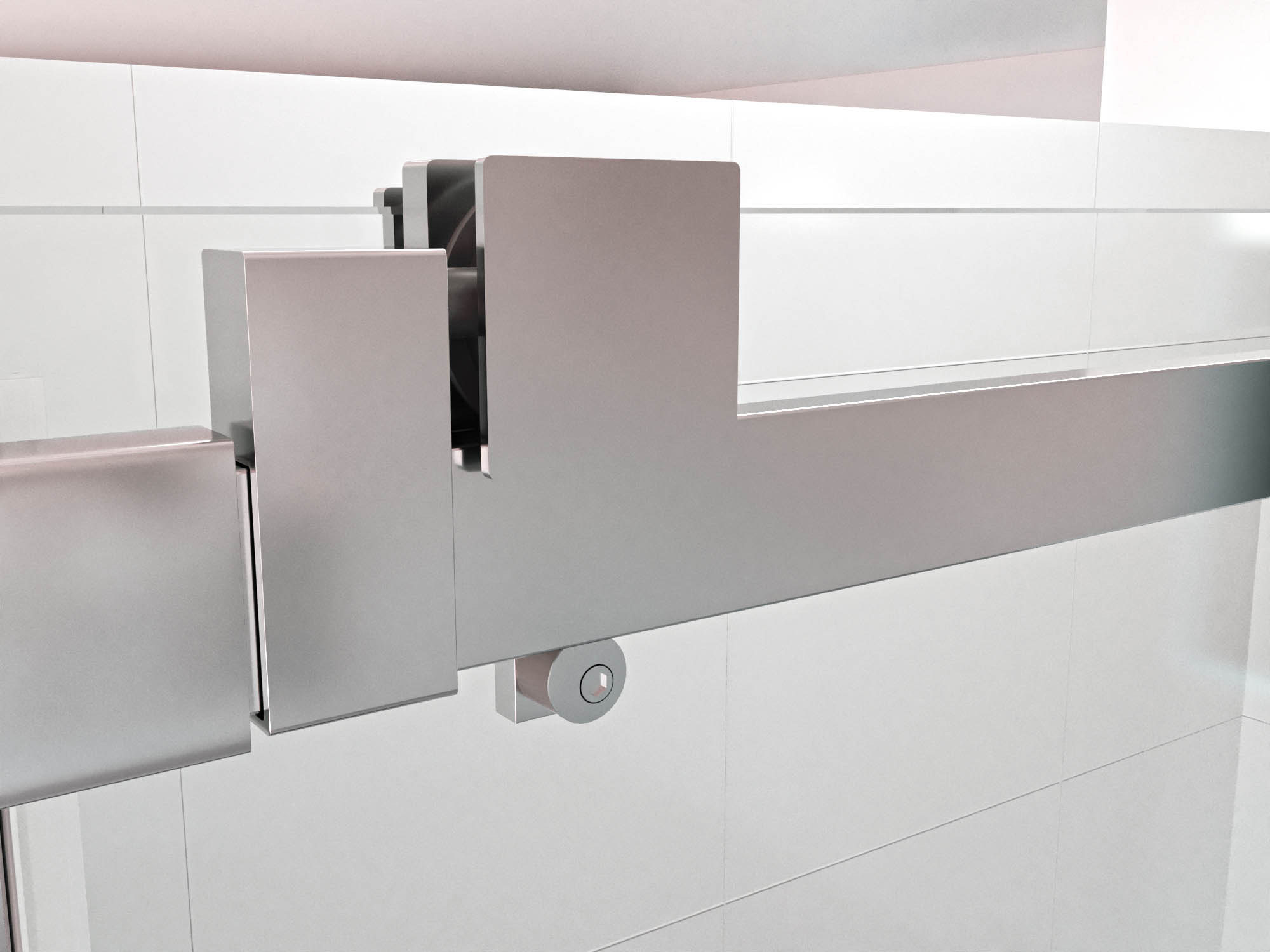 • Sistema de rodamientos aéreos cuadrados en acero inoxidable con tope antidescuelgue integrados.
