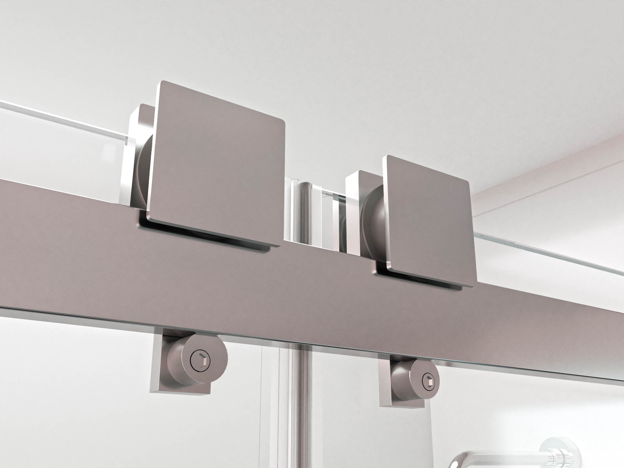 • Sistema de rodamientos aéreos cuadrados en acero inoxidable con tope antidescuelgue integrados.