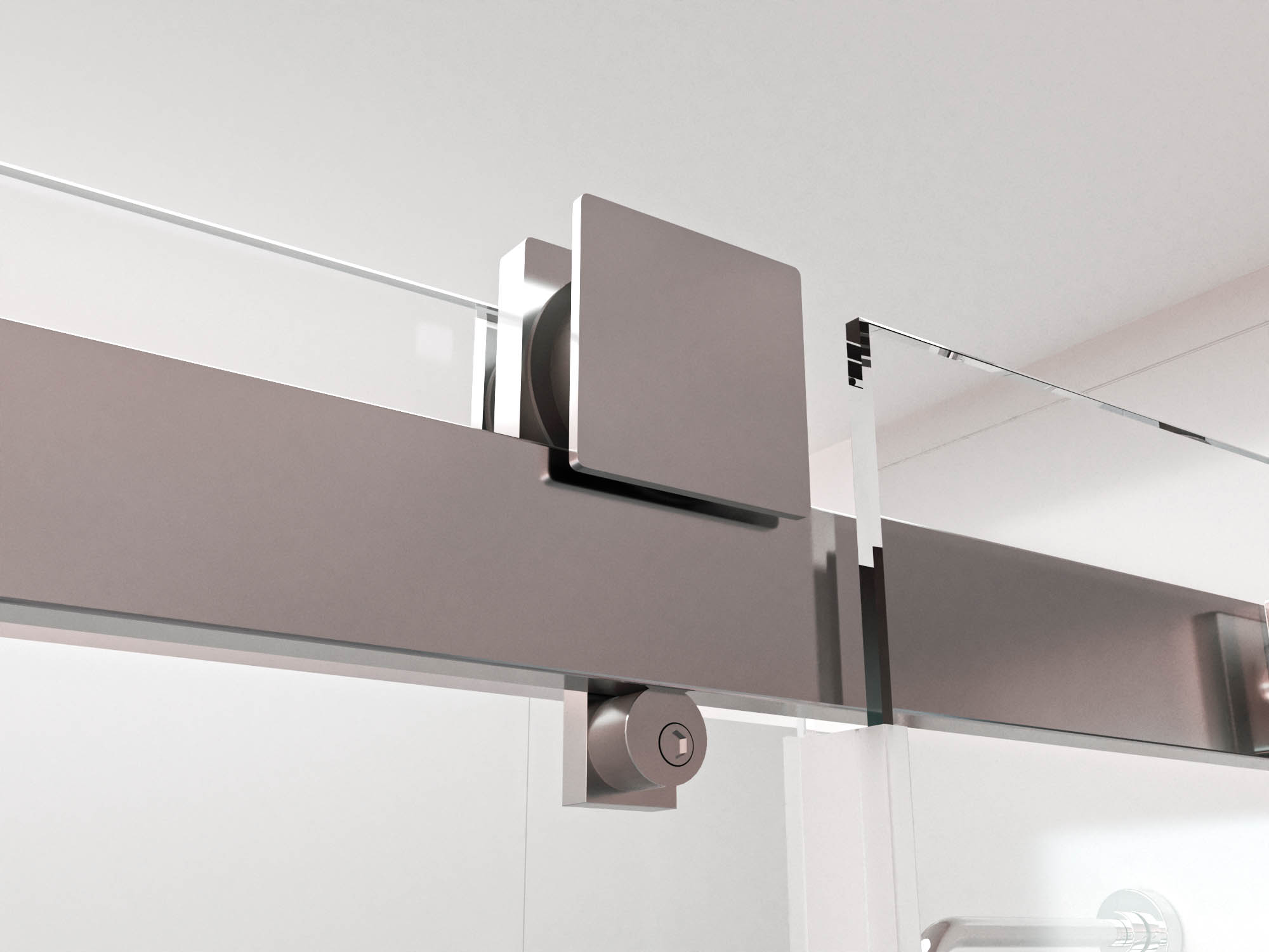 • Sistema de rodamientos aéreos cuadrados en acero inoxidable con tope antidescuelgue integrados.